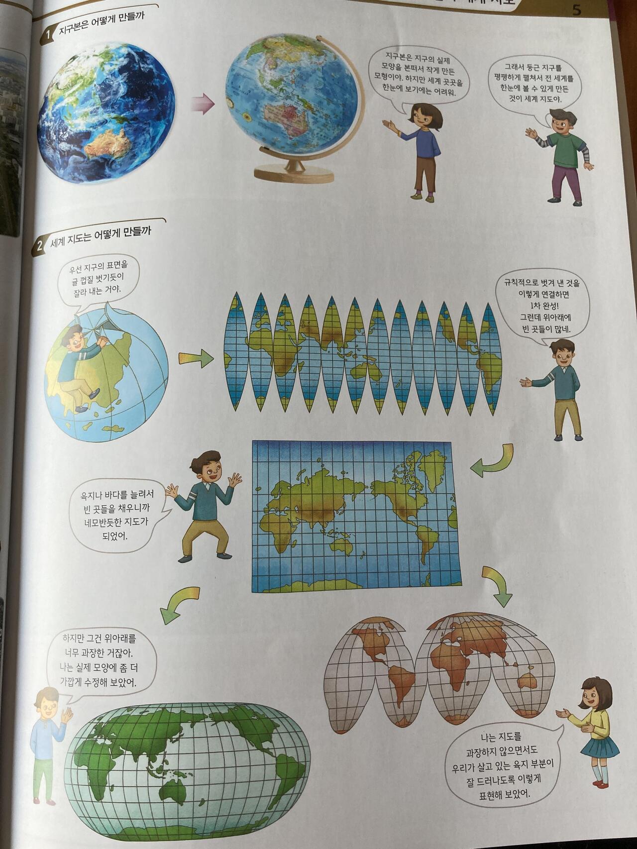 이렇게 입체인 지구본을 만드는 방법과 평면에 그려지는 세계 지도를 만드는 방법도 알려준다.