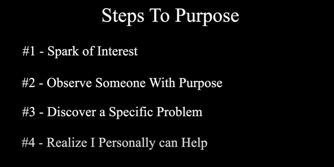 마지막으로 가장 중요한 목표를 향해 가는 단계를 확인해 보라. 흥미를 느끼고, 목적을 가지고 누군가를 관찰하고, 특별한 문제를 발견해 내고, 개인적으로 도와줄 수 있는 것을 깨닫는 과정을 통해 목표를 이룰 수 있다고 한다.