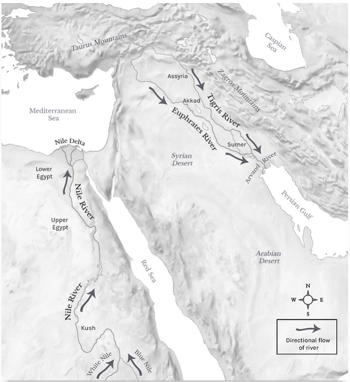 이어서 4대 문명이 탄생했다. 기원전 3000년경 메소포타미아의 티그리스와 유프라테스 강 유역, 이집트의 나일강 유역에서는 세계 최초의 문명이 탄생했다. 기원전 2500년경에는 인도의 인더스강 유역에서, 그 이후에는 중국의 황허강 유역에서 문명이 발달했다. 이를 4대 문명의 발상지라고 하는데, 이들의 공통된 특징은 강을 중심으로 문명의 토대를 이루었다는 것이다. 이 지역들은 아열대성 기후의 지역으로 토지가 비옥하고 농경과 어업에 적합했다. 또한 모두 다 강 유역에 위치했기 때문에 교통과 무역이 편리했다. 가끔 강물이 범람하여 큰 어려움이 닥치곤 했지만 그 시련을 마을 사람들이 함께 극복하는 가운데 공동체 생활이 시작되었고, 국가의 기반을 이루게 되었다.