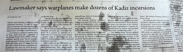 Chinese and Russian warplanes have repeatedly violated Korea's air defense identification zone (Kadiz). As a result, the Korean Defense Ministry expressed concern and scrambled fighter jets in response. Diplomatic efforts are necessary to address and resolve the situation.