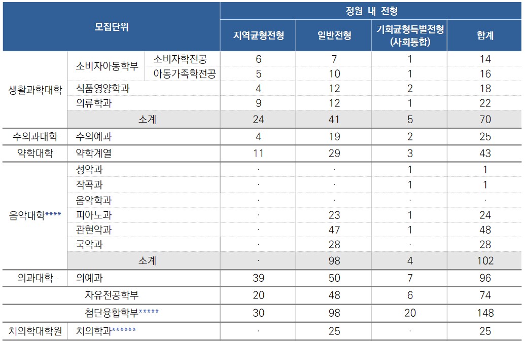 2024년 의대 수시 정원은 96명, 치대는 25명, 수의대는 25명, 약대는 43명이다.