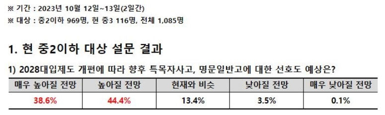 지난 설문에 따르면 부모들도 특목자사고, 명문일반고 선호도가 높아질 것으로 생각하고 있다는 걸 알 수 있따.