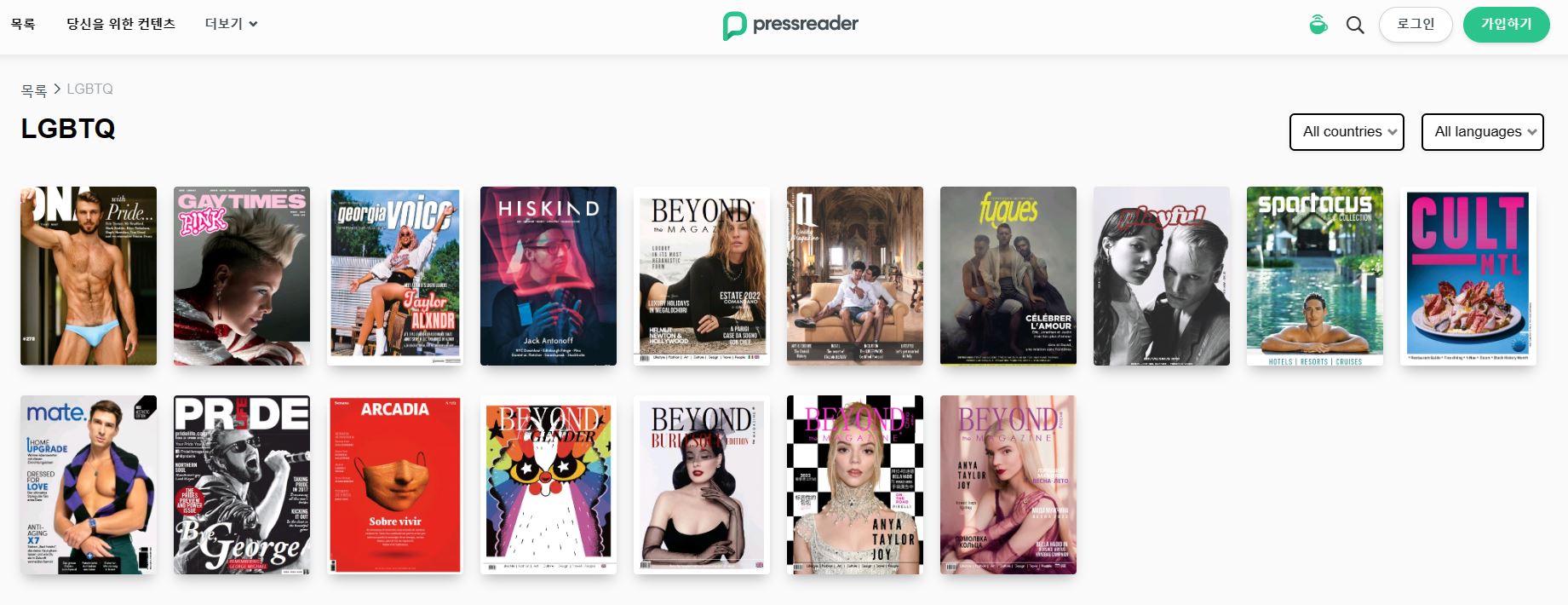 LGBTQ는 Lesbian, Gay, Bi, Transgender, Qeer 로 각각 레즈, 게이, 바이, 트랜스, 퀴어의 성소수자를 뜻하는 말이라고 한다. 이러한 잡지들은 대형서점에서 구매할 수 있겠지만 무료로 볼 수 있는 방법도 있다. 다음은 국립중앙도서관 매거진에 들어가 보면 볼 수 있는 LGBTQ 잡지이다.