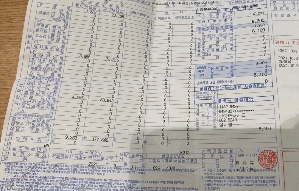 수술 비용은 성모병원 2인실에서 200만원 좀 더 나왔고, 방사선 치료는 기억이 나지 않을 정도로 조금 나왔다.
