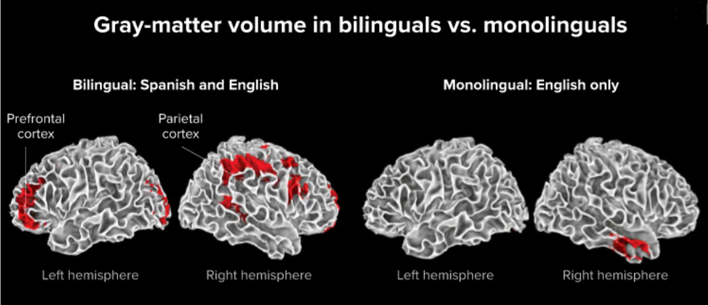결론부터 말하자면 언어를 배우는 것이다. 즉, 언어를 배우면 뇌 건강을 챙길 수 있다고 한다. 뇌의 신경회로를 자극하기 때문일 거라 생각된다. 다음 사진에서 볼 수 있듯이 두 가지 언어를 한 뇌의 회백질(gray matter)이 한 가지 언어를 할 때보다 확연히 더 많다. 회백질은 중추신경에서 신경세포가 모여 있는 곳으로, 회백질이 줄어들면 인지 기능이 떨어지고 치매에 걸린다. 이런 점에서 볼 때 언어를 학습하는 것은 인지 기능을 높여주고 뇌의 기능을 활성화시키는 데 도움이 준다고 볼 수 있겠다.